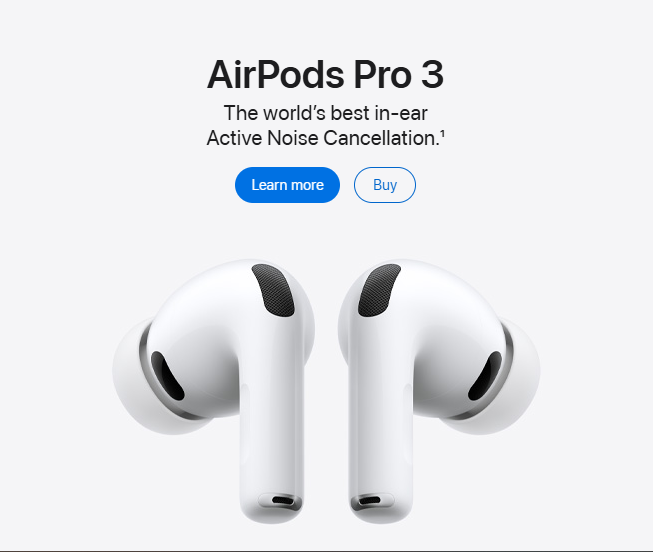 - 1. Testing conducted by Apple in July 2025 using AirPods Pro 3 paired with iPhone 16 with pre-release AirPods firmware and iOS 26. Noise reduction was tested in accordance with IEC 60268-24. Comparison made against the best-selling wireless in-ear headphones commercially available at the time of testing. Performance depends on device settings, environment and many other factors.